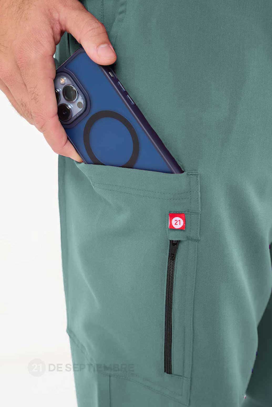 El conjunto incluye una casaca de corte recto con escote en V, tres bolsillos funcionales (dos inferiores tipo plaqué y uno superior tipo ojal), tajos laterales para mayor comodidad y porta gafete incorporado. El pantalón náutico cuenta con bolsillos frontales, bolsillo trasero tipo plaqué, bolsillo cargo y pretina elastizada con cordón regulable.