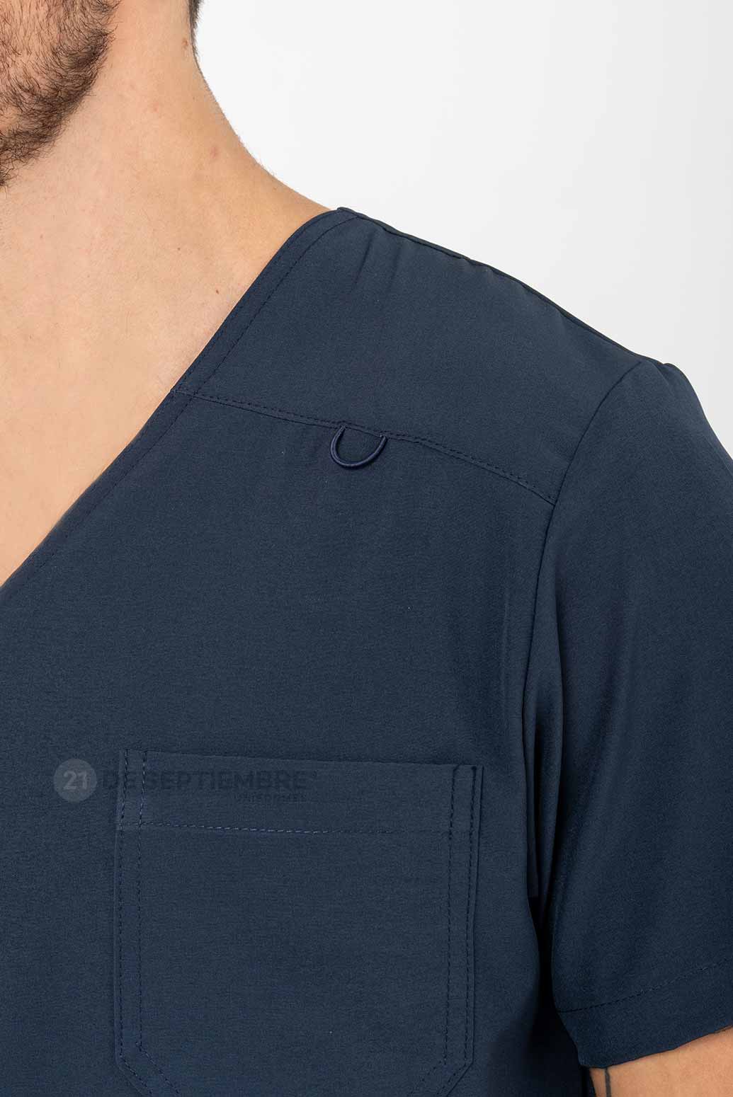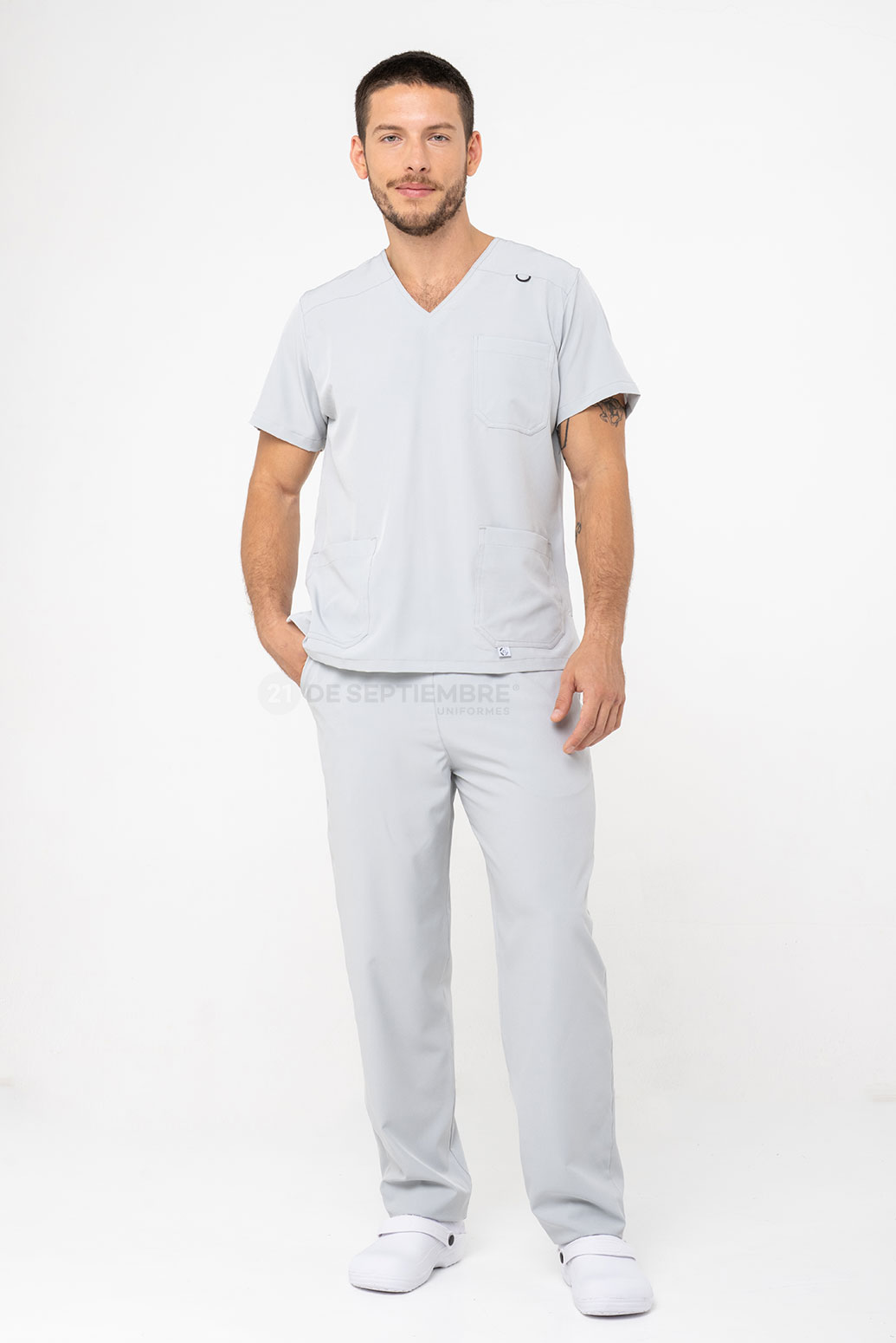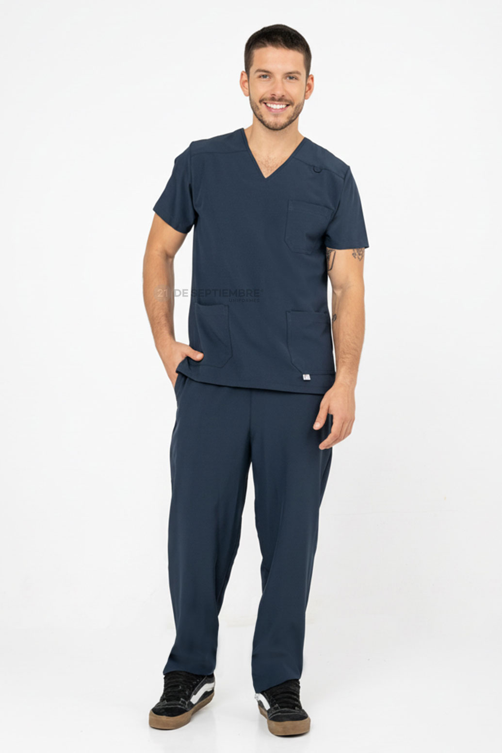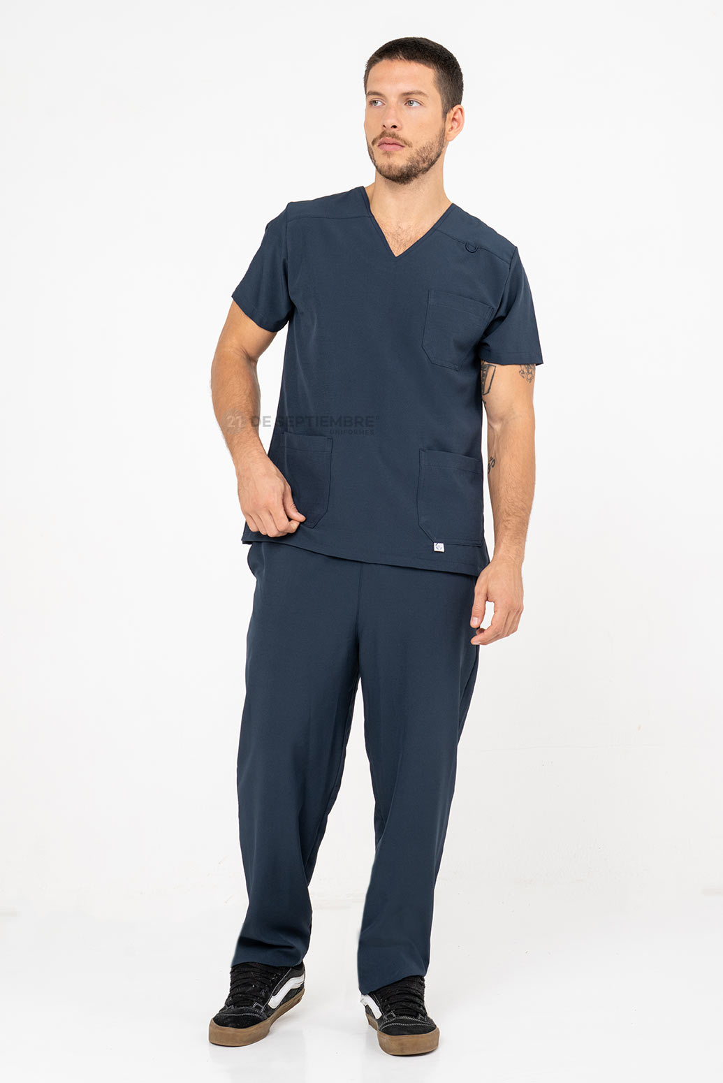 La casaca presenta escote en V con terminaciones modernas, bolsillos funcionales, portagafete y tajos laterales que favorecen el movimiento. El pantalón tipo náutico incorpora cintura elastizada con cordón, dos bolsillos frontales y uno trasero.