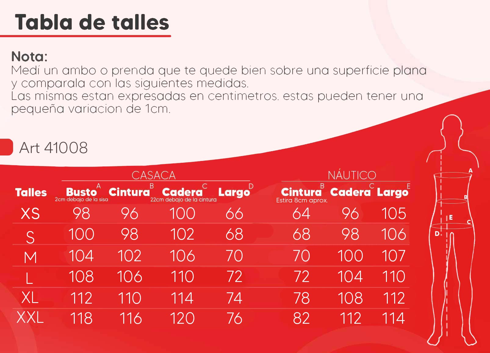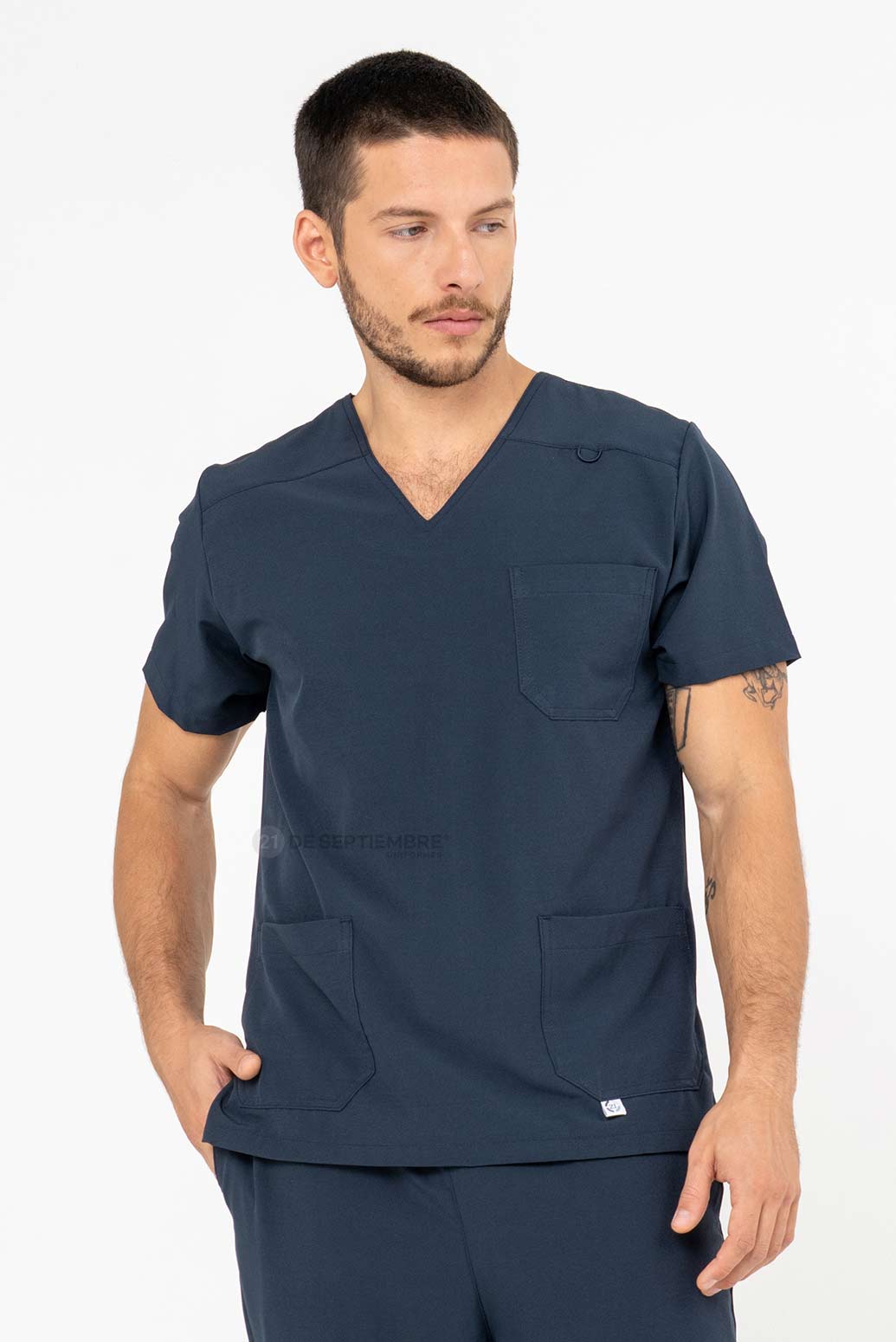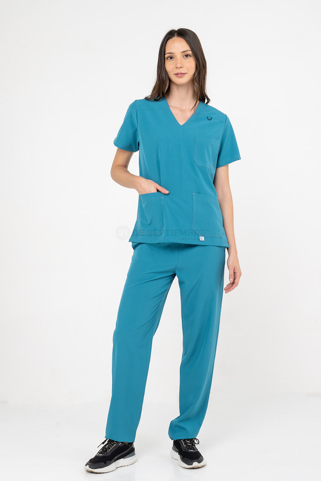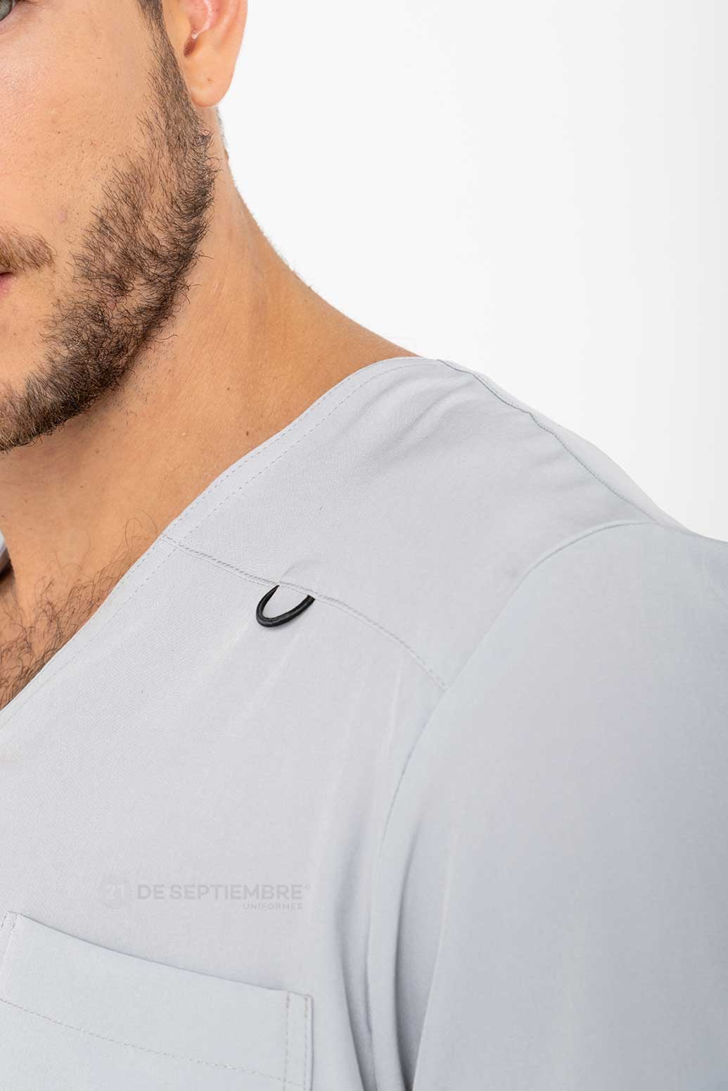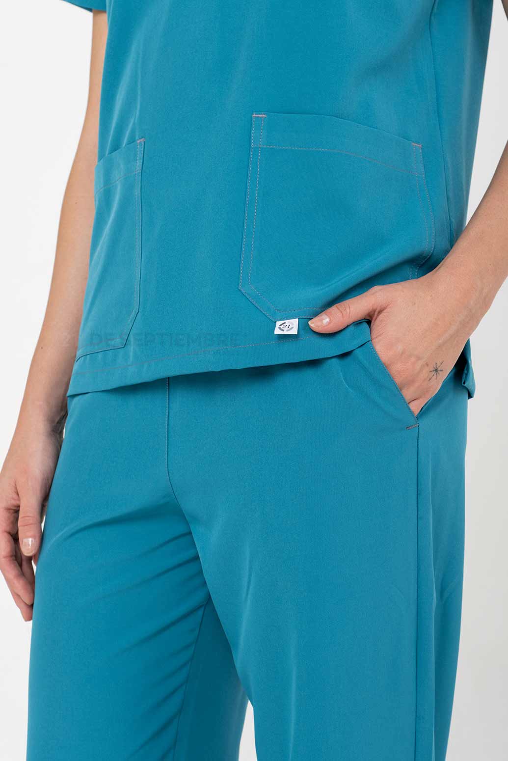 La casaca presenta escote en V con terminaciones modernas, bolsillos funcionales, portagafete y tajos laterales que favorecen el movimiento. El pantalón tipo náutico incorpora cintura elastizada con cordón, dos bolsillos frontales y uno trasero.