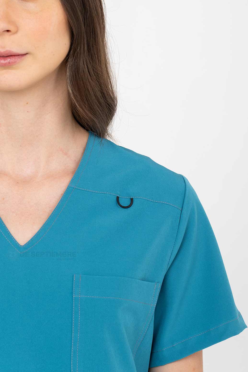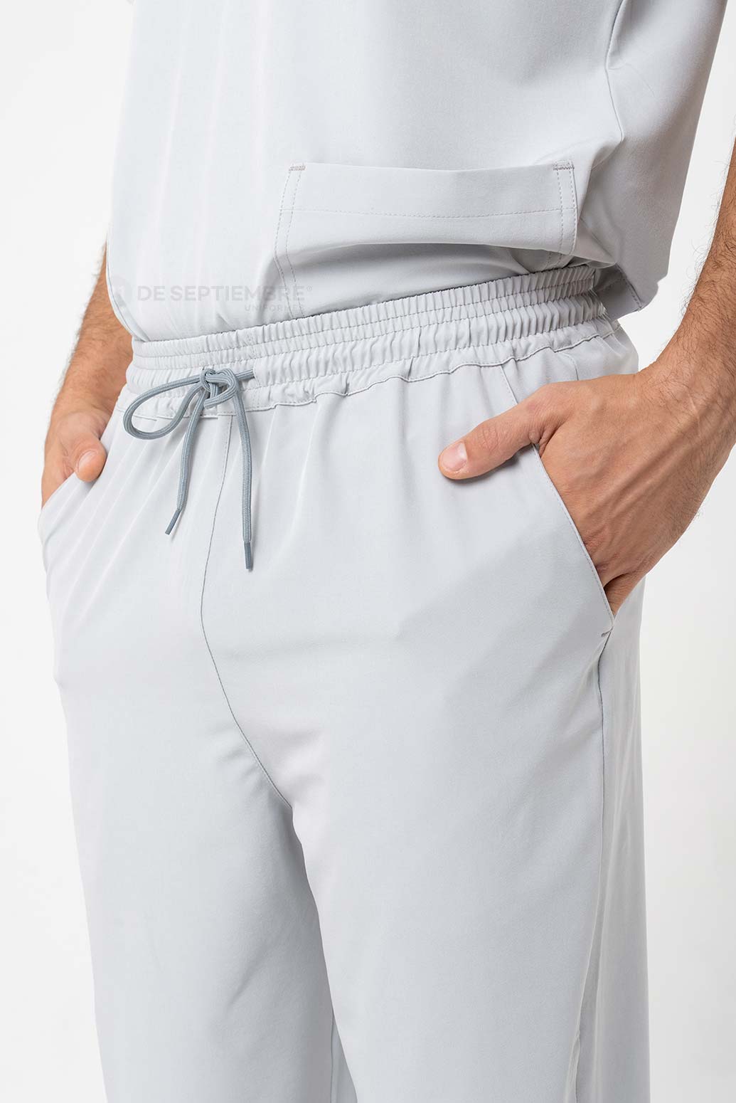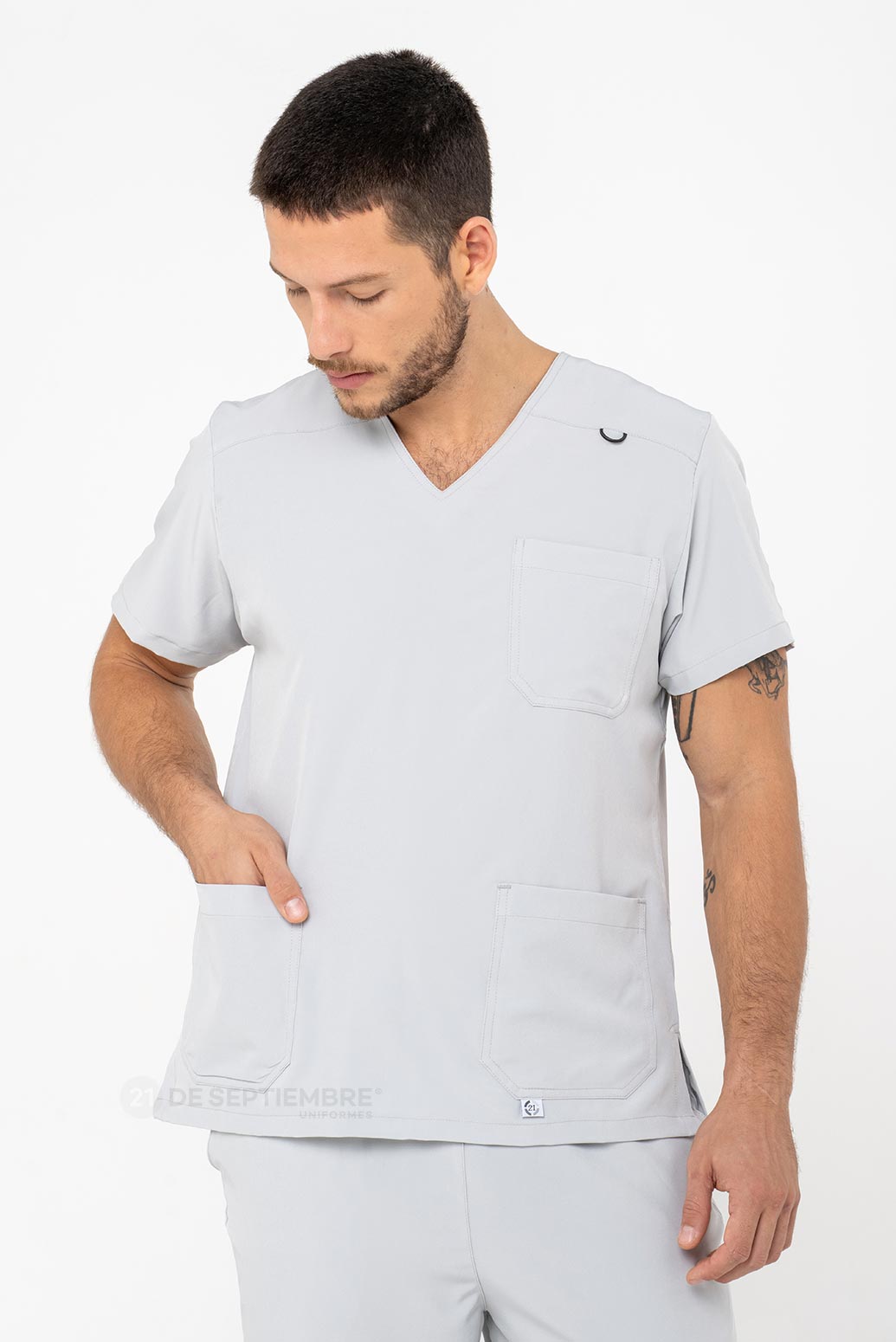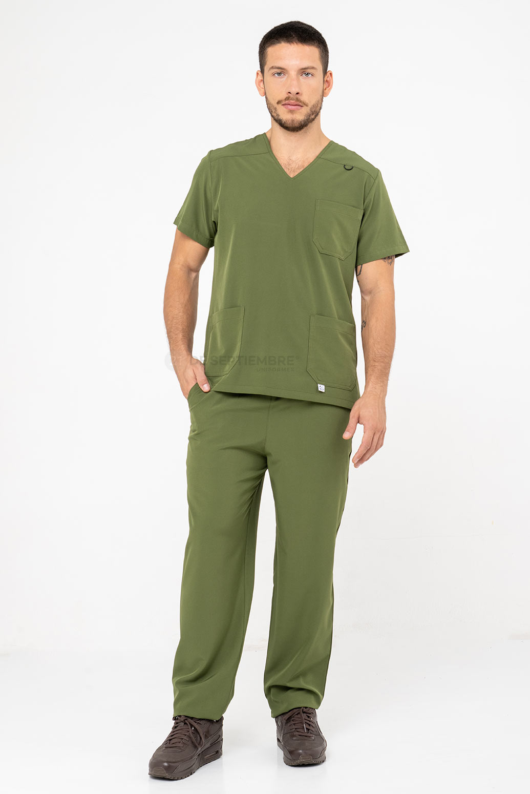 La casaca presenta escote en V con terminaciones modernas, bolsillos funcionales, portagafete y tajos laterales que favorecen el movimiento. El pantalón tipo náutico incorpora cintura elastizada con cordón, dos bolsillos frontales y uno trasero.