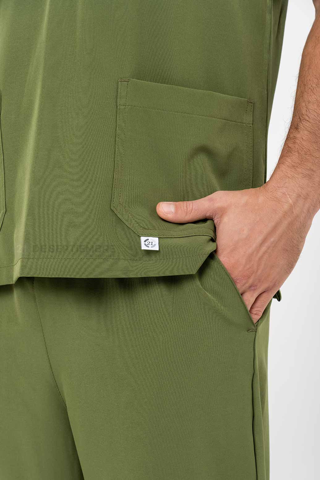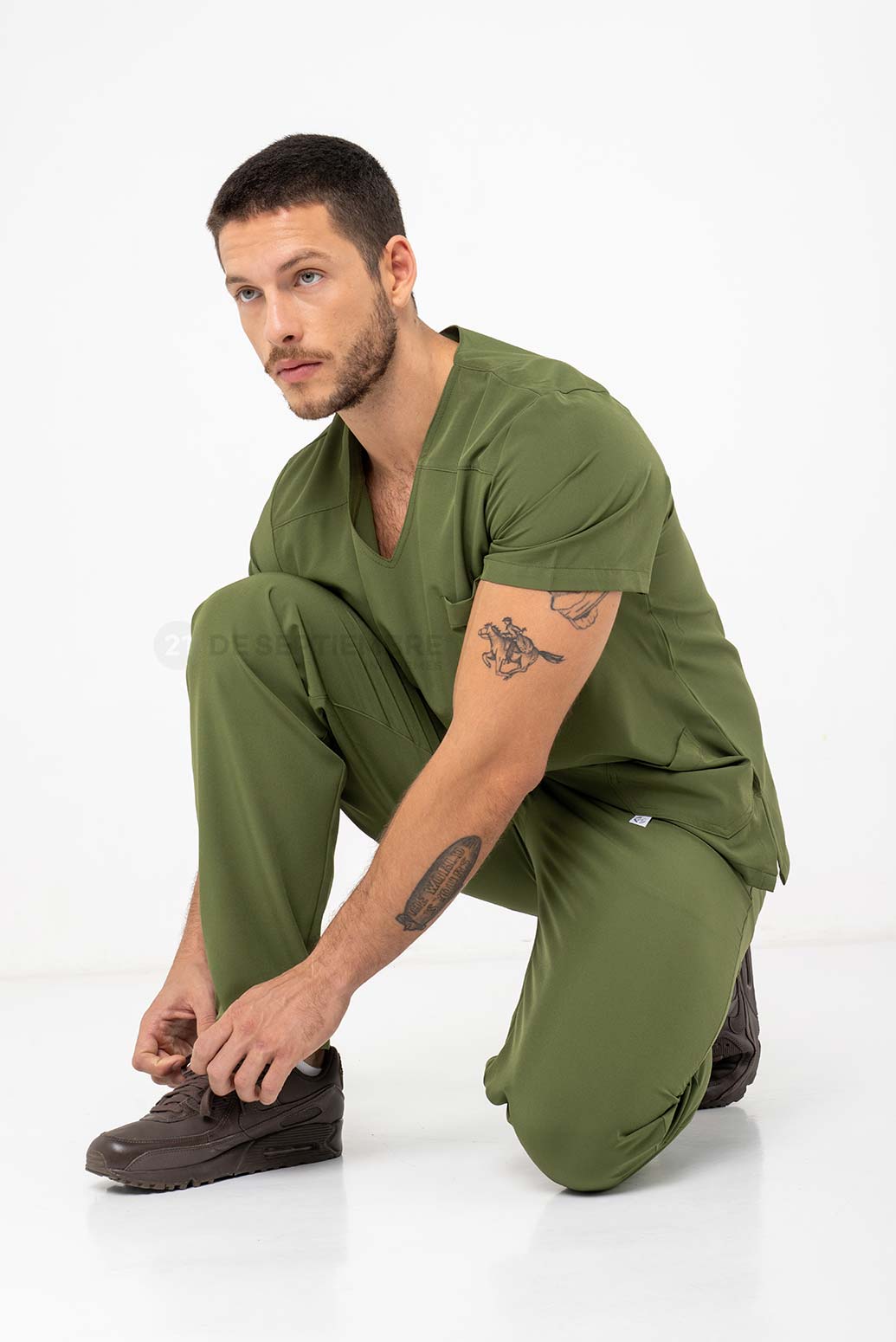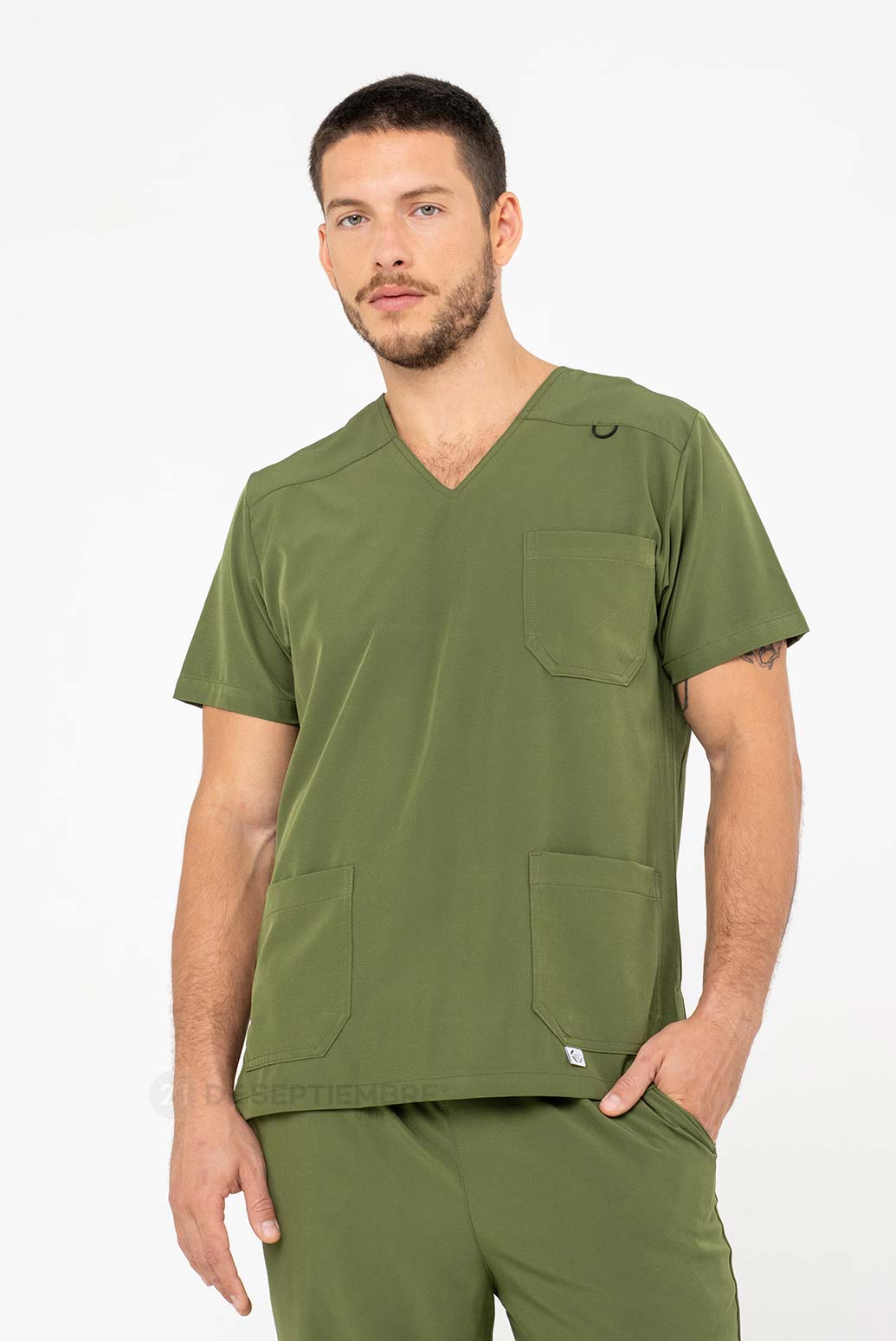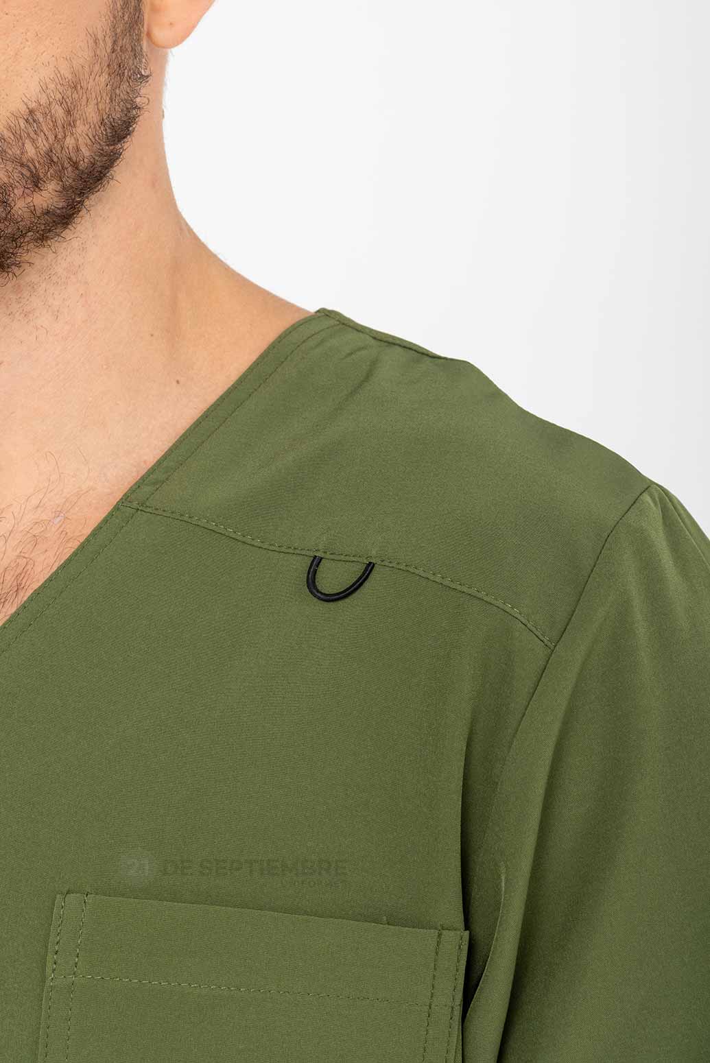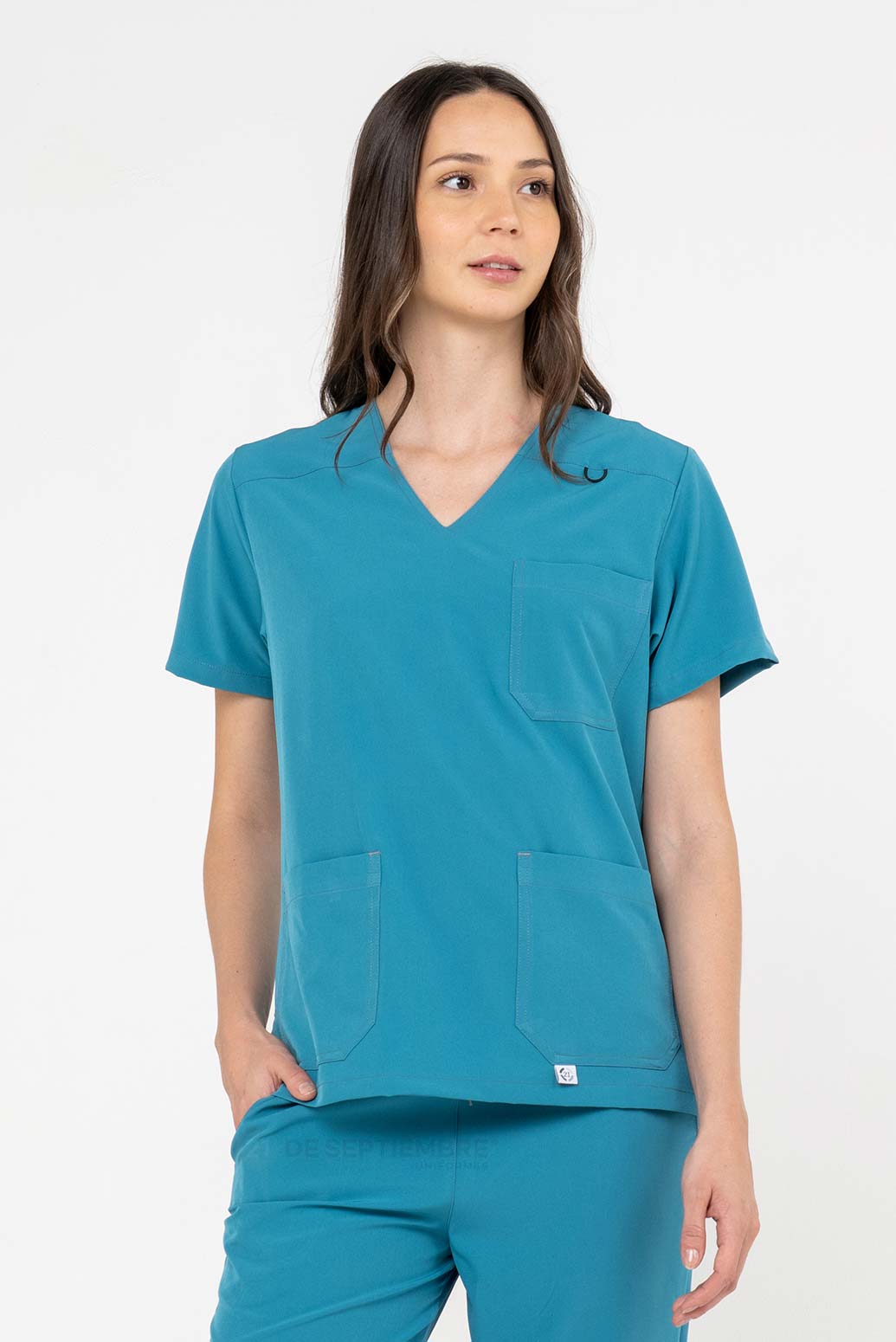 La casaca presenta escote en V con terminaciones modernas, bolsillos funcionales, portagafete y tajos laterales que favorecen el movimiento. El pantalón tipo náutico incorpora cintura elastizada con cordón, dos bolsillos frontales y uno trasero.