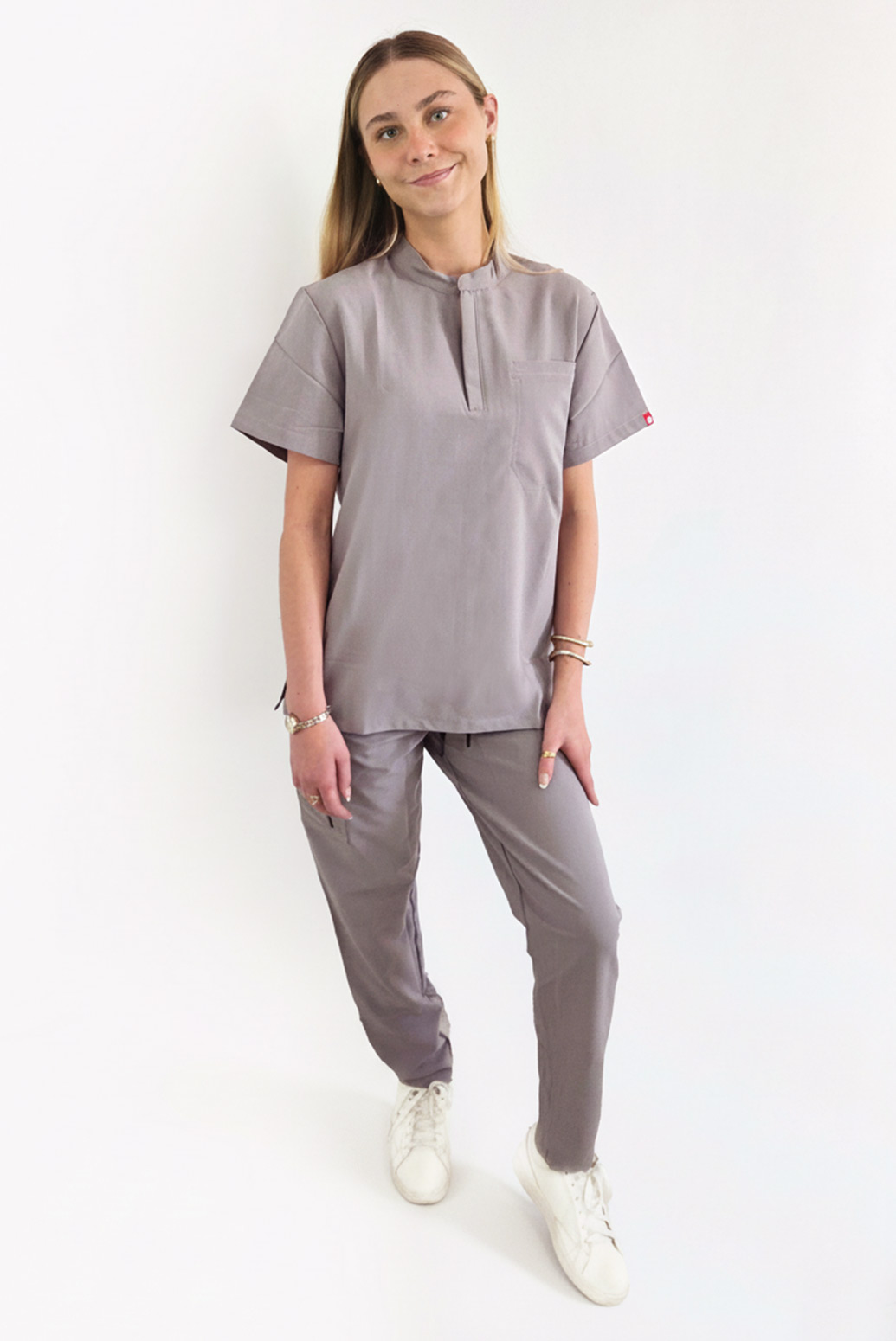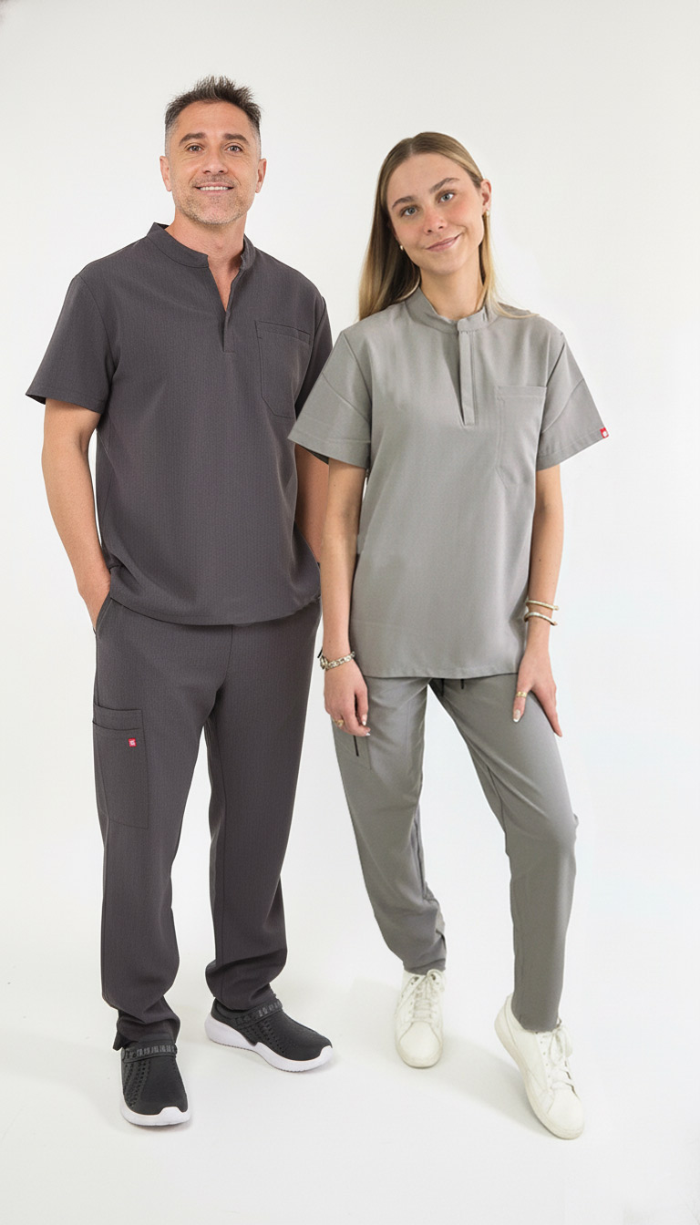 La casaca presenta un moderno corte oversize con cuello mao y cierre frontal, bolsillo superior tipo ojal y tajos laterales para una mayor libertad de movimiento. El pantalón náutico incluye bolsillos frontales, uno trasero tipo plaqué y un doble bolsillo cargo, con pretina elastizada y cordón para ajuste personalizado.