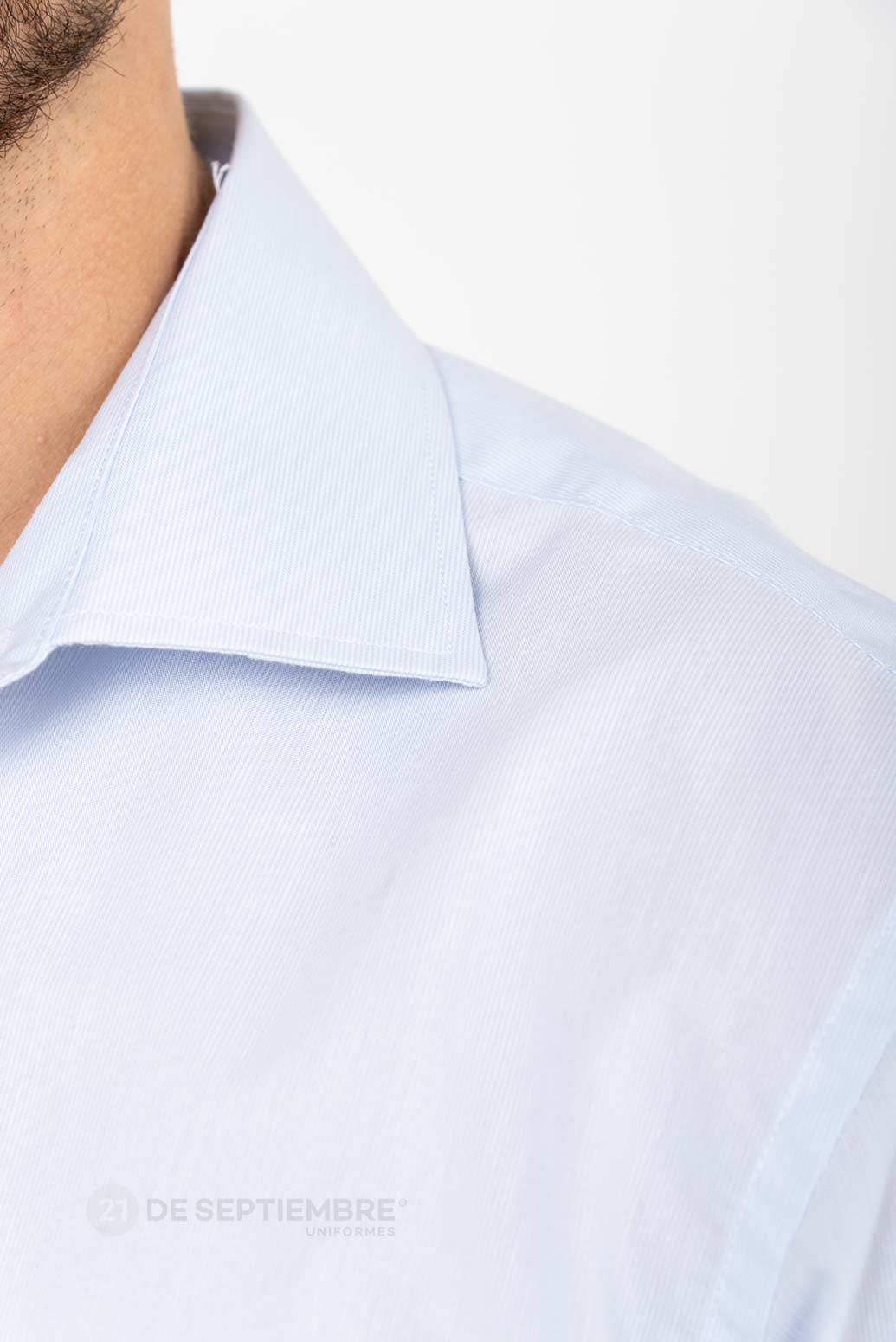 El delicado rayado en celeste aqua con líneas finas le aporta un aspecto moderno y versátil, que permite usarla tanto en contextos formales como en outfits casuales, manteniendo siempre una imagen cuidada.