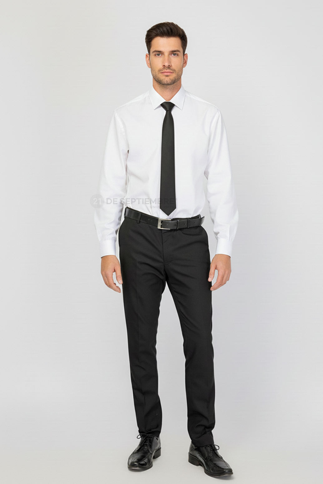 Su diseño de corte regular con tiro medio presenta una línea recta y botamanga levemente entallada (20 cm de ancho final), logrando un calce moderno y equilibrado. Incluye bolsillos delanteros diagonales y dos bolsillos traseros tipo ojal con botón, reforzados con costuras en zonas de mayor uso para garantizar durabilidad. La cintura cuenta con pasadores para cinturón, cierre con botón y cremallera, e incorpora botones de repuesto.